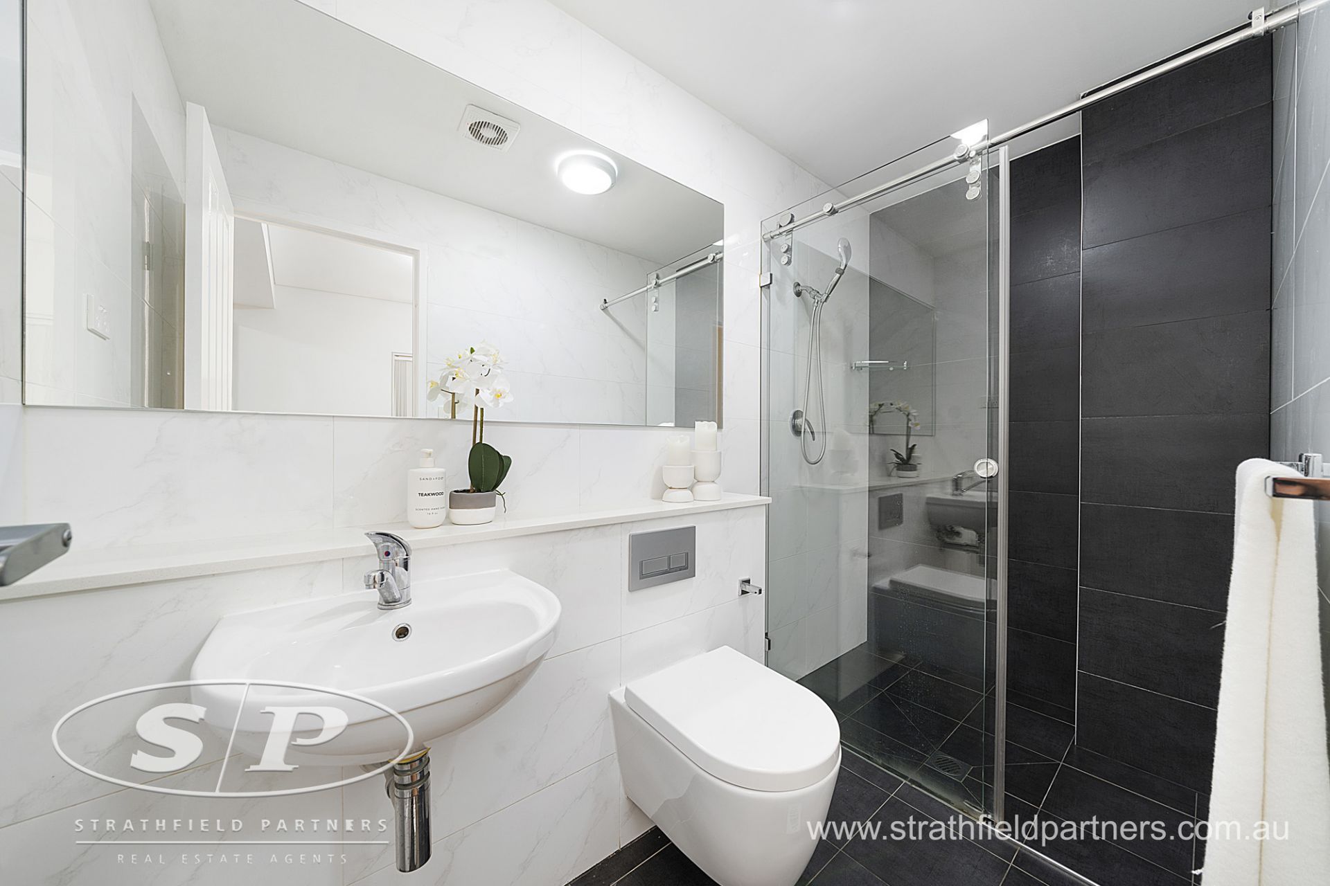 - Modern bathroom with floor to ceiling tiles, walk in shower, marble-look detailing